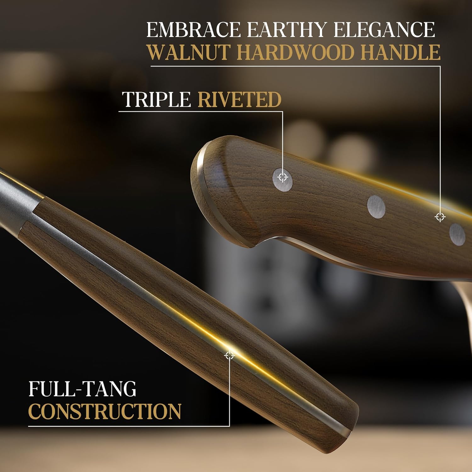 【Luxury Walnut Handles with Soft Grip Comfort】 Crafted from walnut wood with a triple-rivet design, the ergonomic handles combine timeless elegance with modern comfort. The soft-grip feel reduces hand fatigue, while the solid build ensures durability and control even during long cooking sessions.