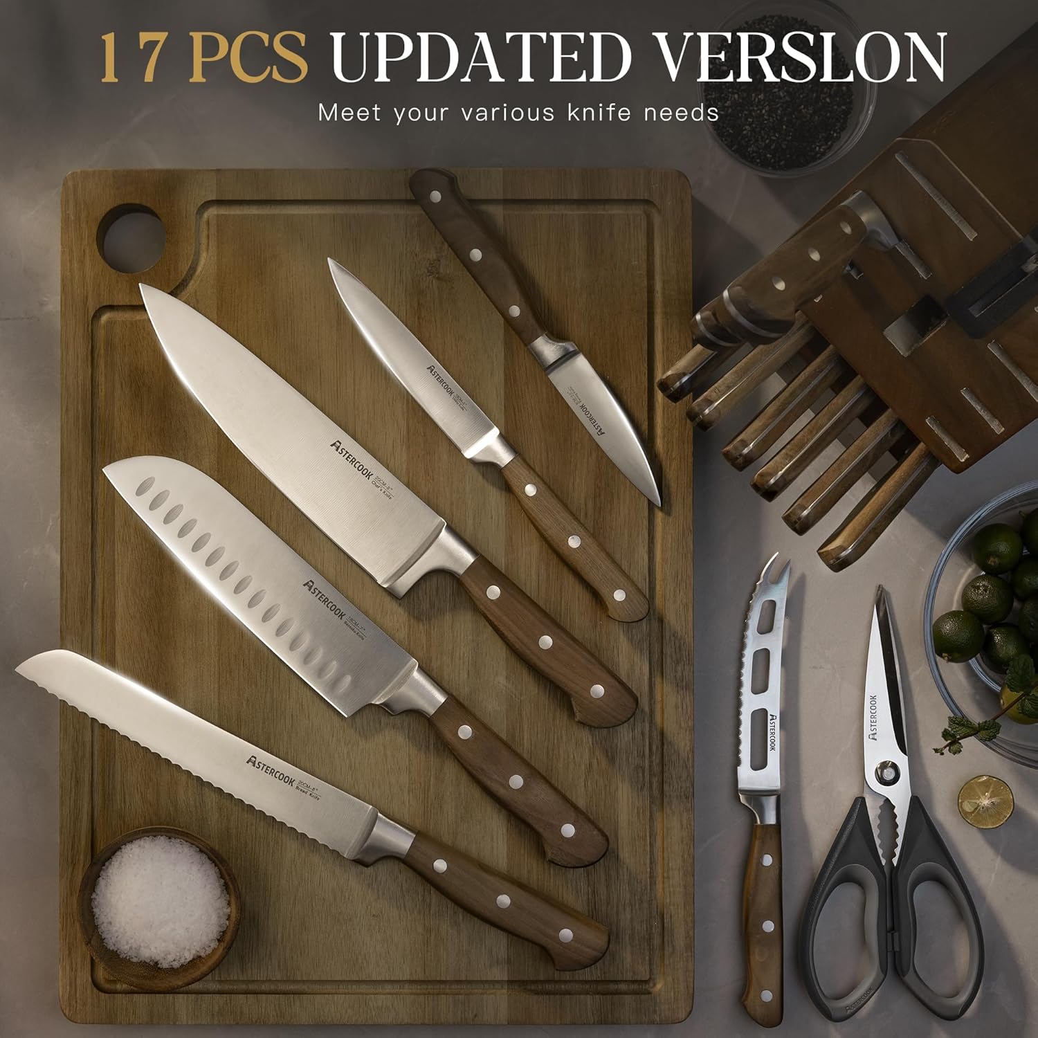 Knife Set, Astercook 17-Pieces Forged Kitchen Knife Block Set – Full-Tang Stainless Steel Knives, Forged Triple Rivet, Luxury Walnut Handles, Gift-Ready Collection