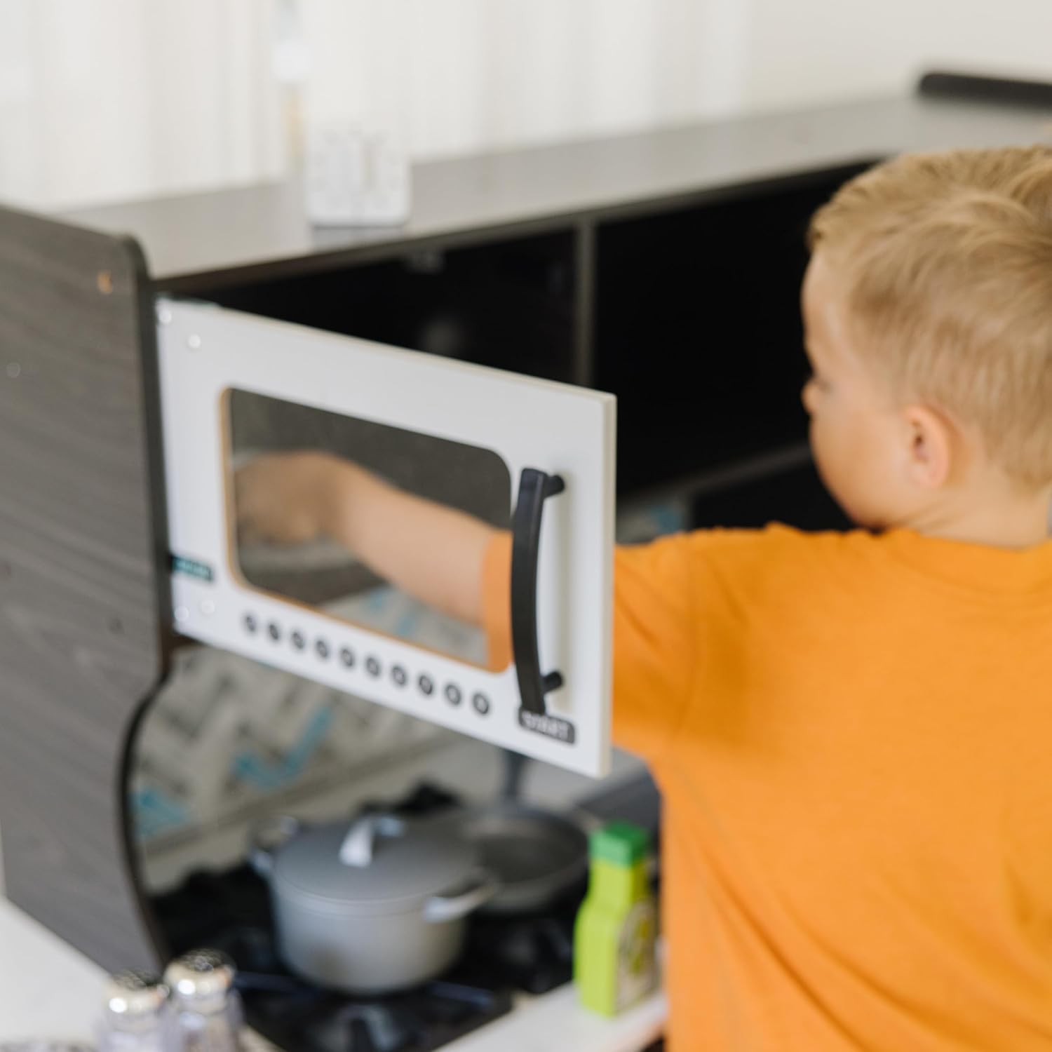 Easy to assemble charcoal-colored wooden modern play kitchen--roomy enough for multiple kids to play at once